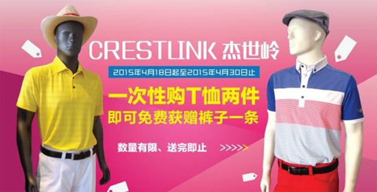 一次性购CRESTLINK 杰世岭品牌T恤两件,即可免费获赠裤子一条,数量有限、送完即止。
