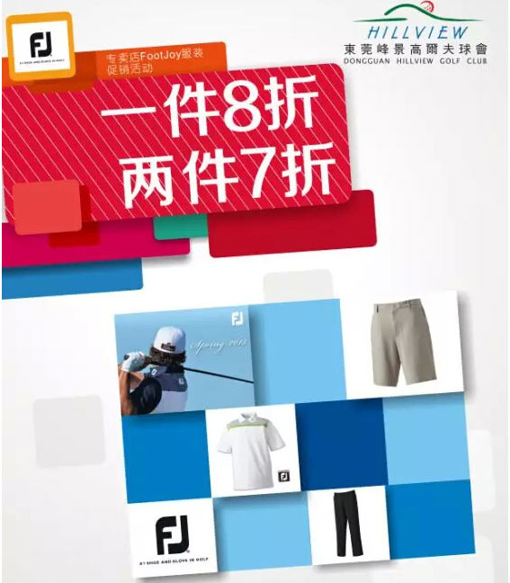 即日起峰景高尔夫球会专卖店FootJoy服饰一件8折,两件7折,欢迎前来选购,售完即止! 咨询热线:0769-22209998-823 抢购地址:东莞峰景高尔夫球会专卖店