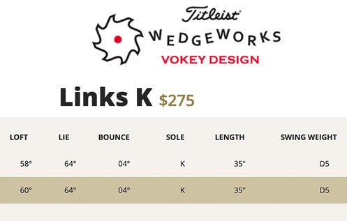 目前Links K型挖起杆提供58度和60度两种角度,反弹角都是4度,官方售价275美金,而且只能通过Titleist在美国的WedgeWorks挖起杆个性化定制来获取。